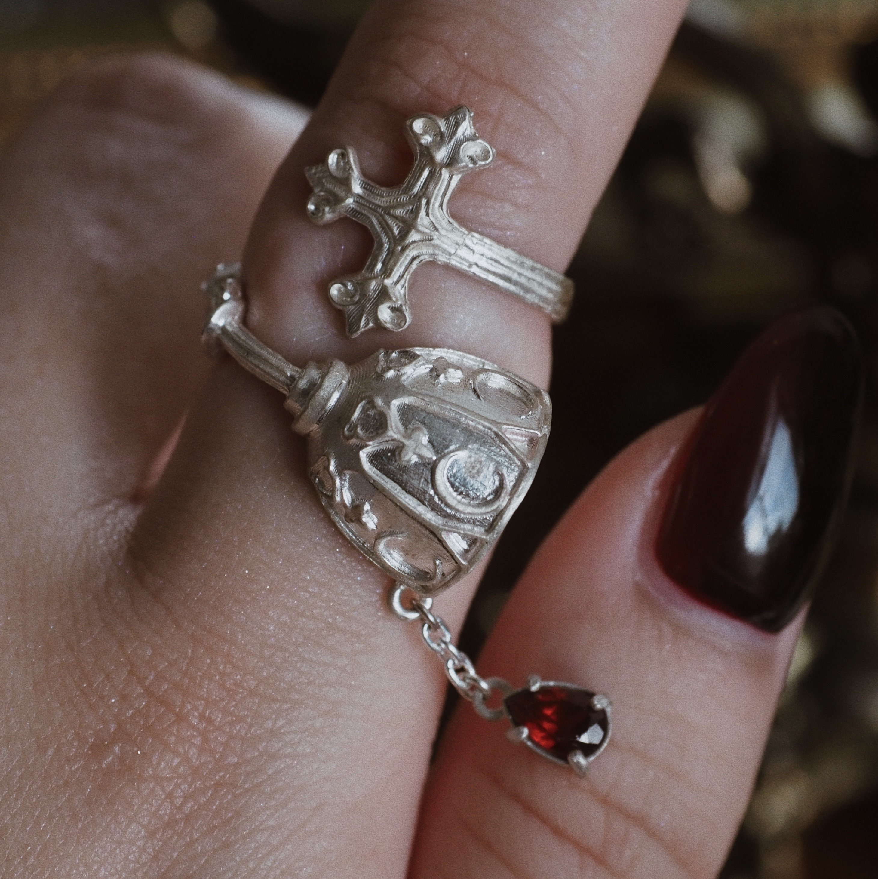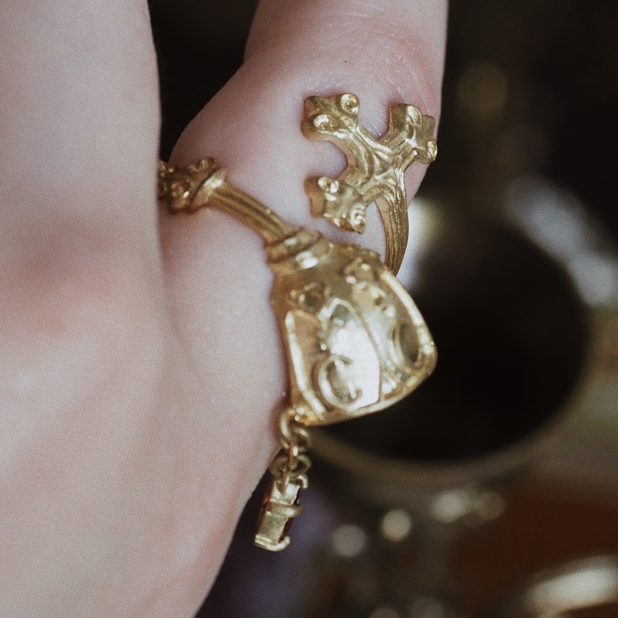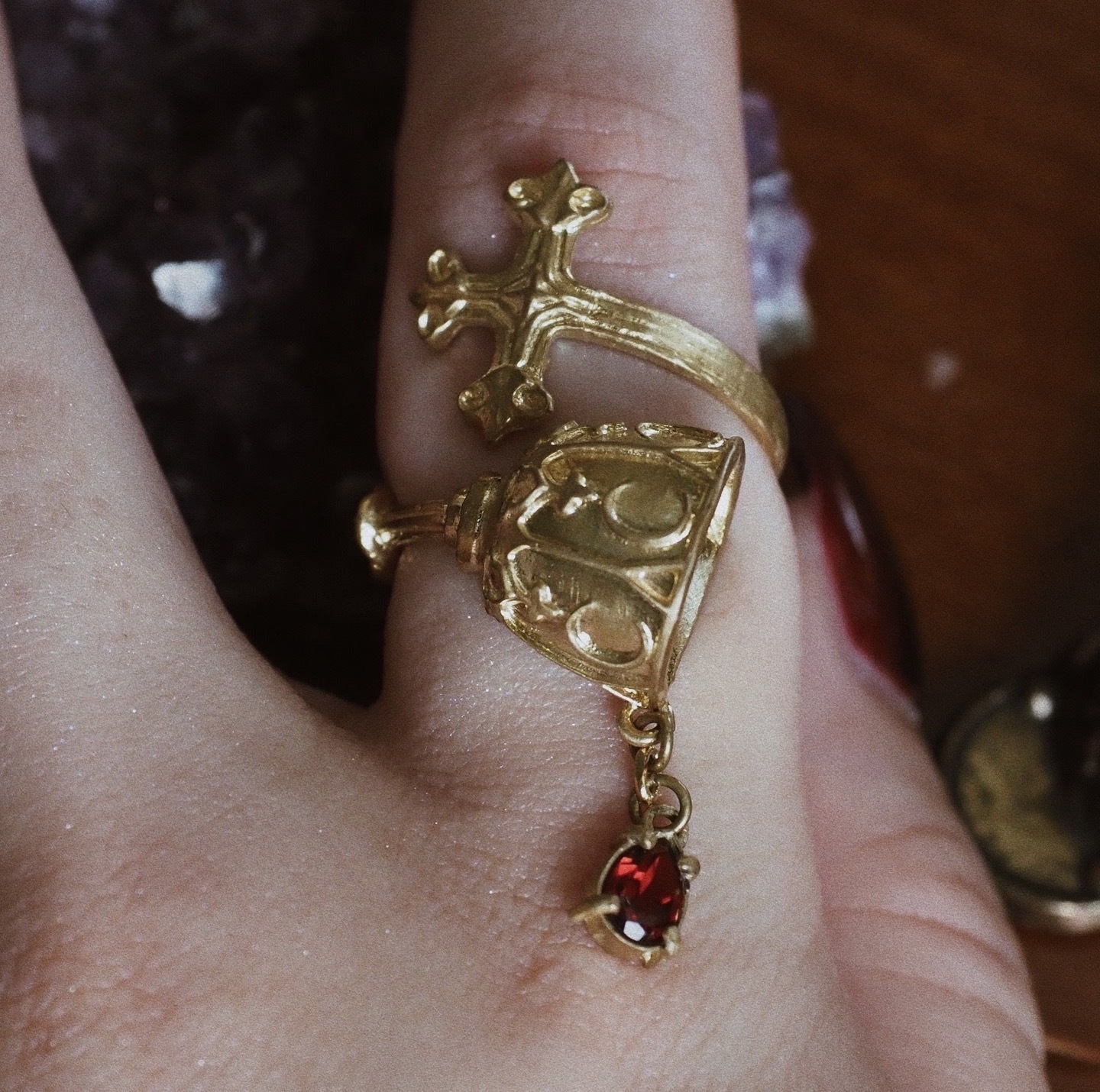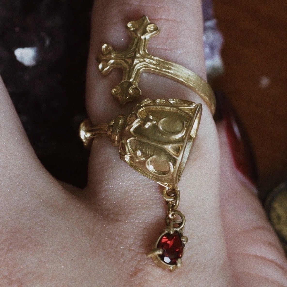 リングを一周してみたときに、十字架にもゴブレットにも見える、そんなデザインになっています。