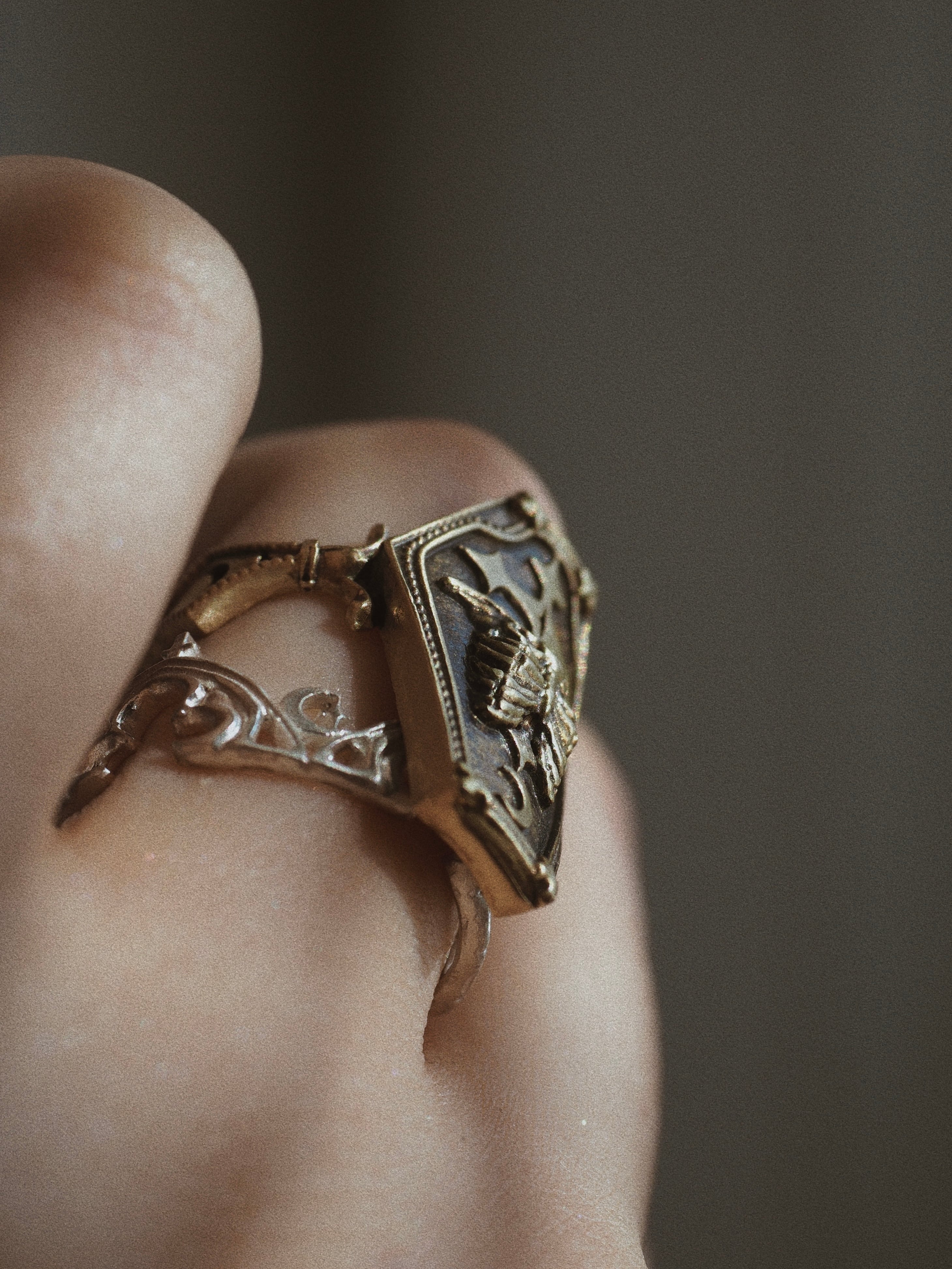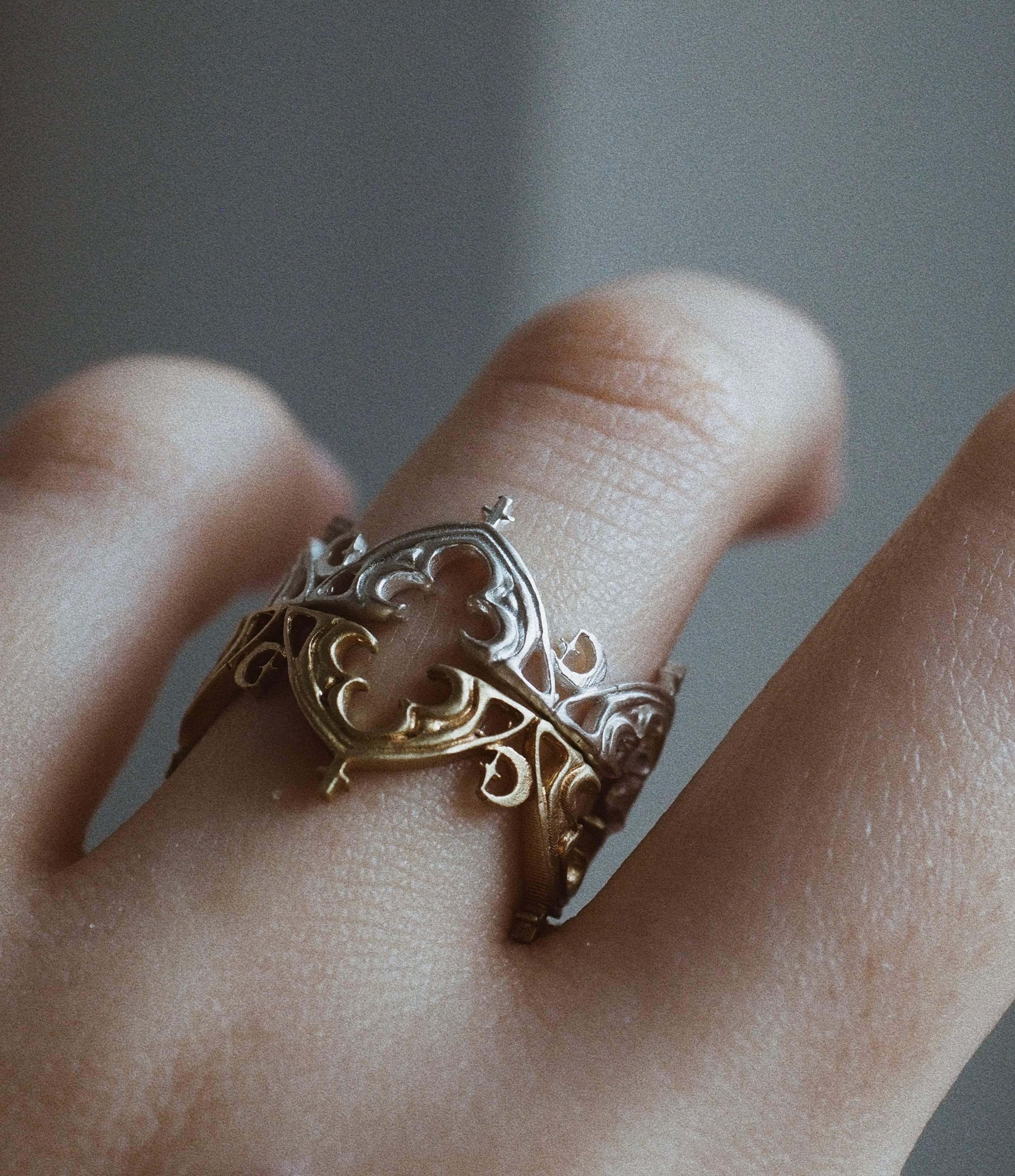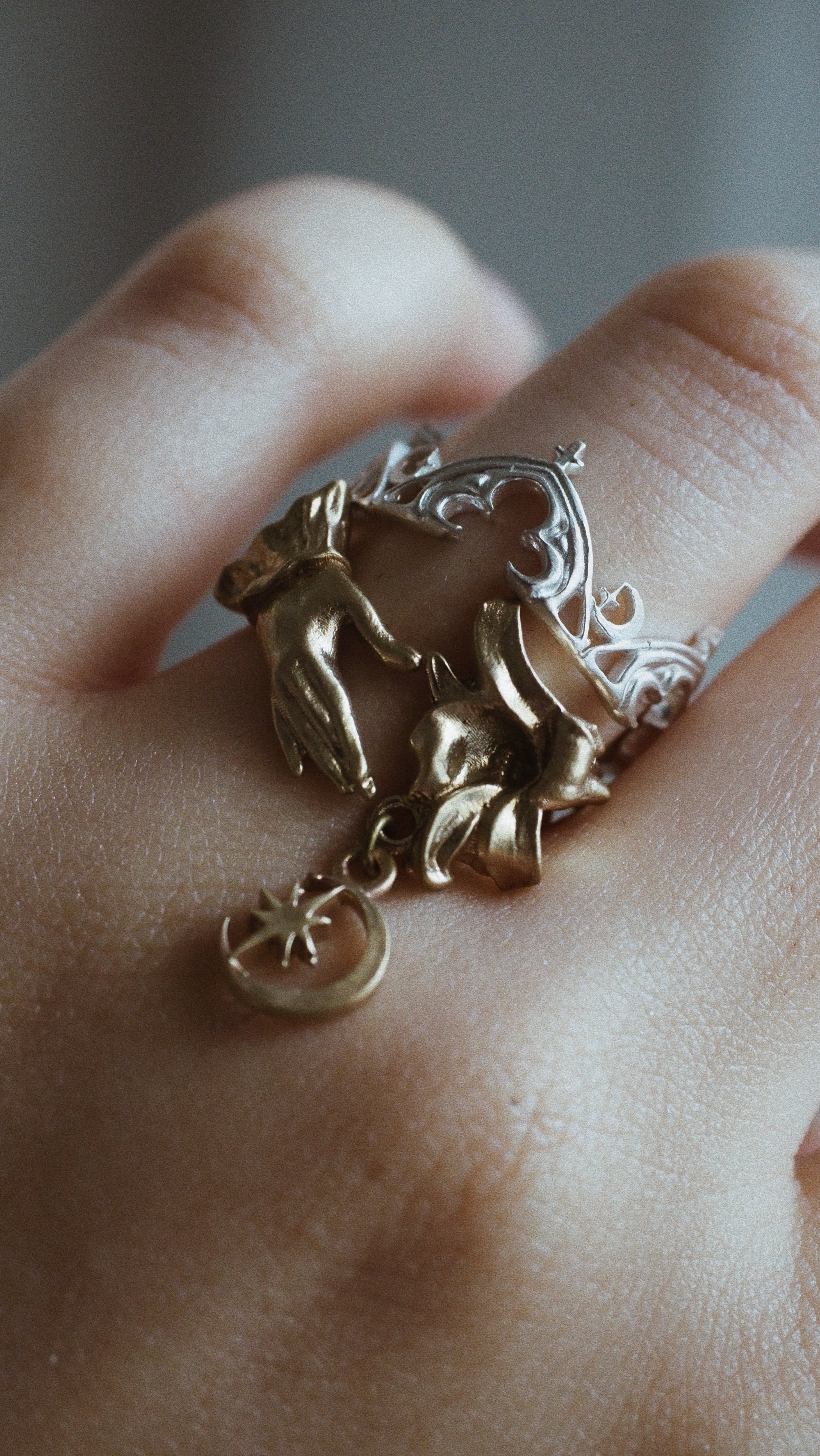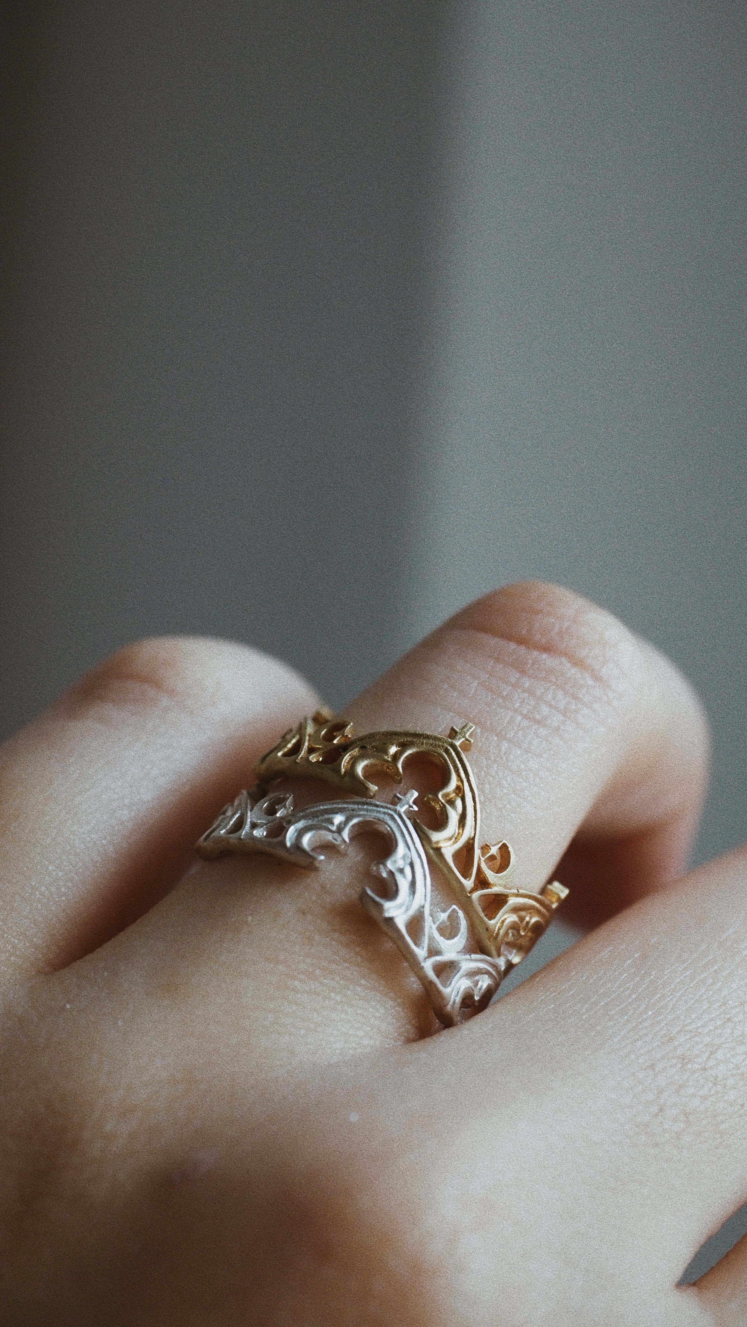 同作品の真鍮とシルバーを上下に着けると、まるで水面に映る教会のように見えたり、他のリングを間に挟むことで、額縁を身につけているようにコーディネートできたりと、幅広くお楽しみいただけます。