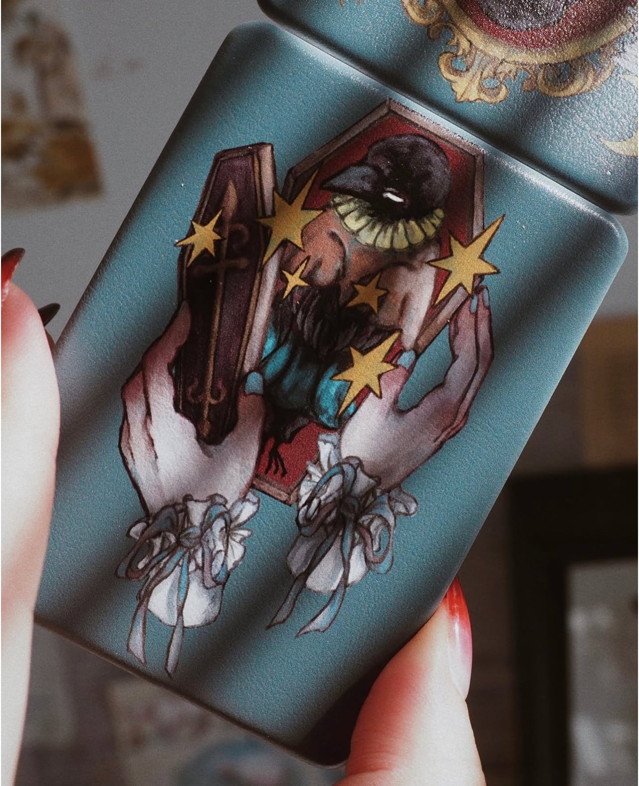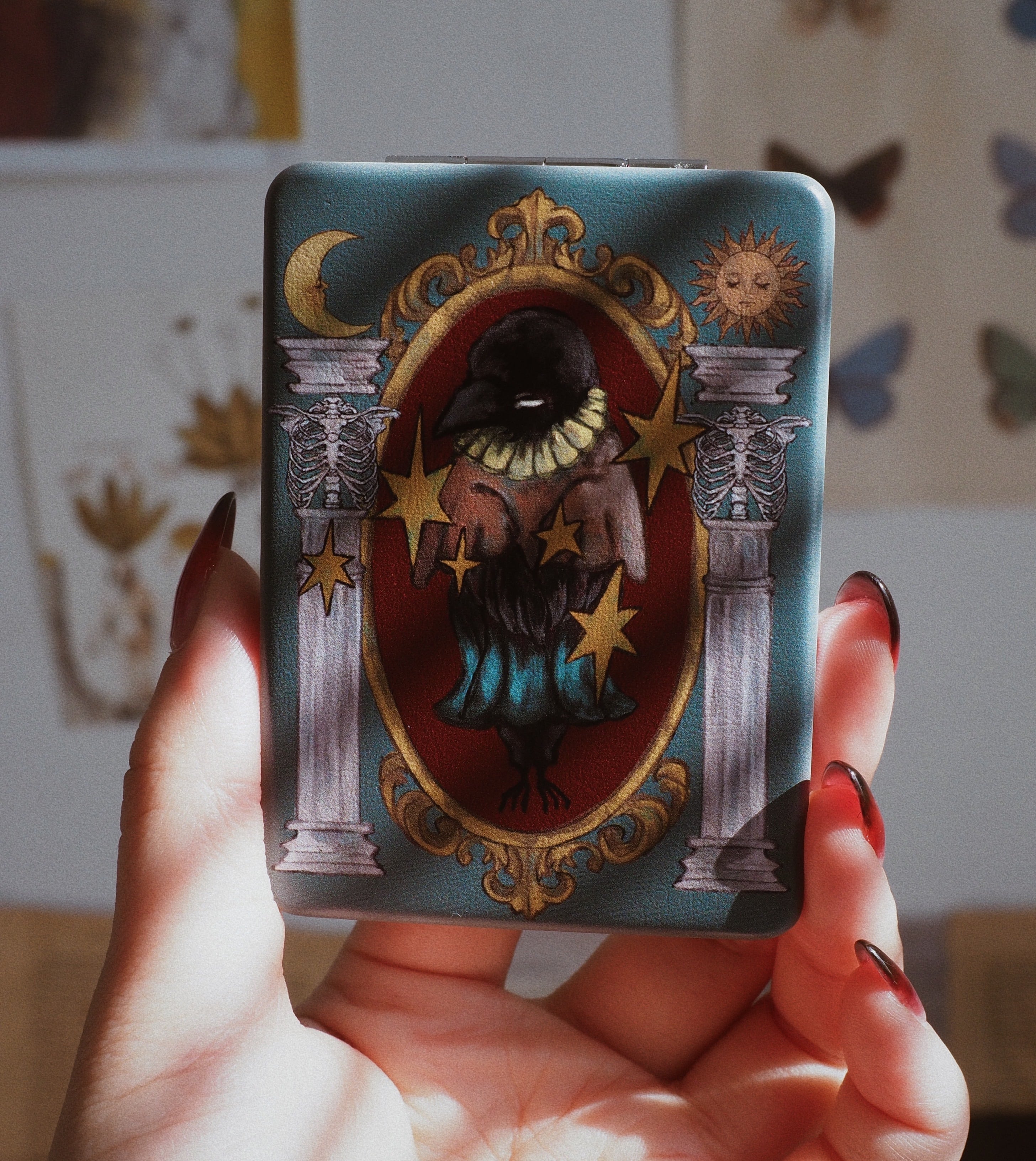 表裏で違う場所に眠る淑女なカラスが描かれている合皮製ミラーです。