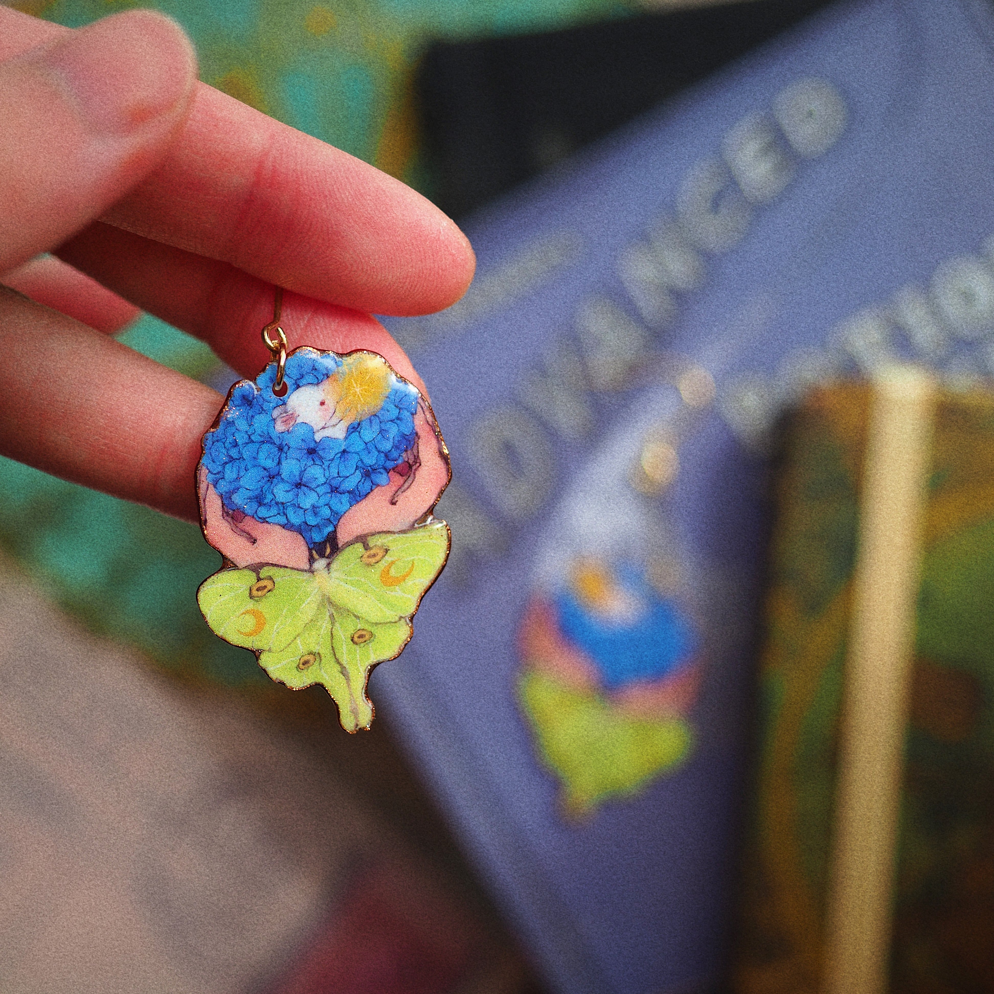 花から覗くねずみは星屑を抱え、支える両の手にはまるで花束を包むように美しいおおみずあおがとまっています。