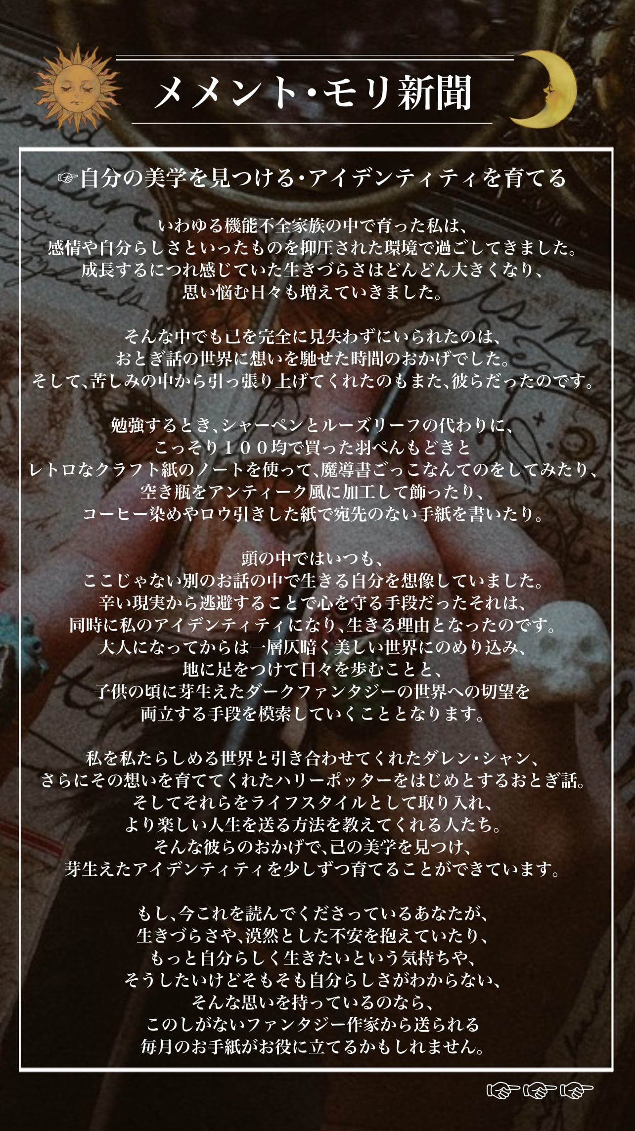 星屑たちの記憶の小噺、キャラクターたちの日常やダークアカデミアをはじめとする、仄暗く美しい世界を日々の生活に取り込み楽しむ方法を、文学・音楽・アート・映画・歴史・インテリア・ファッションなど、さまざまな視点から綴ります。