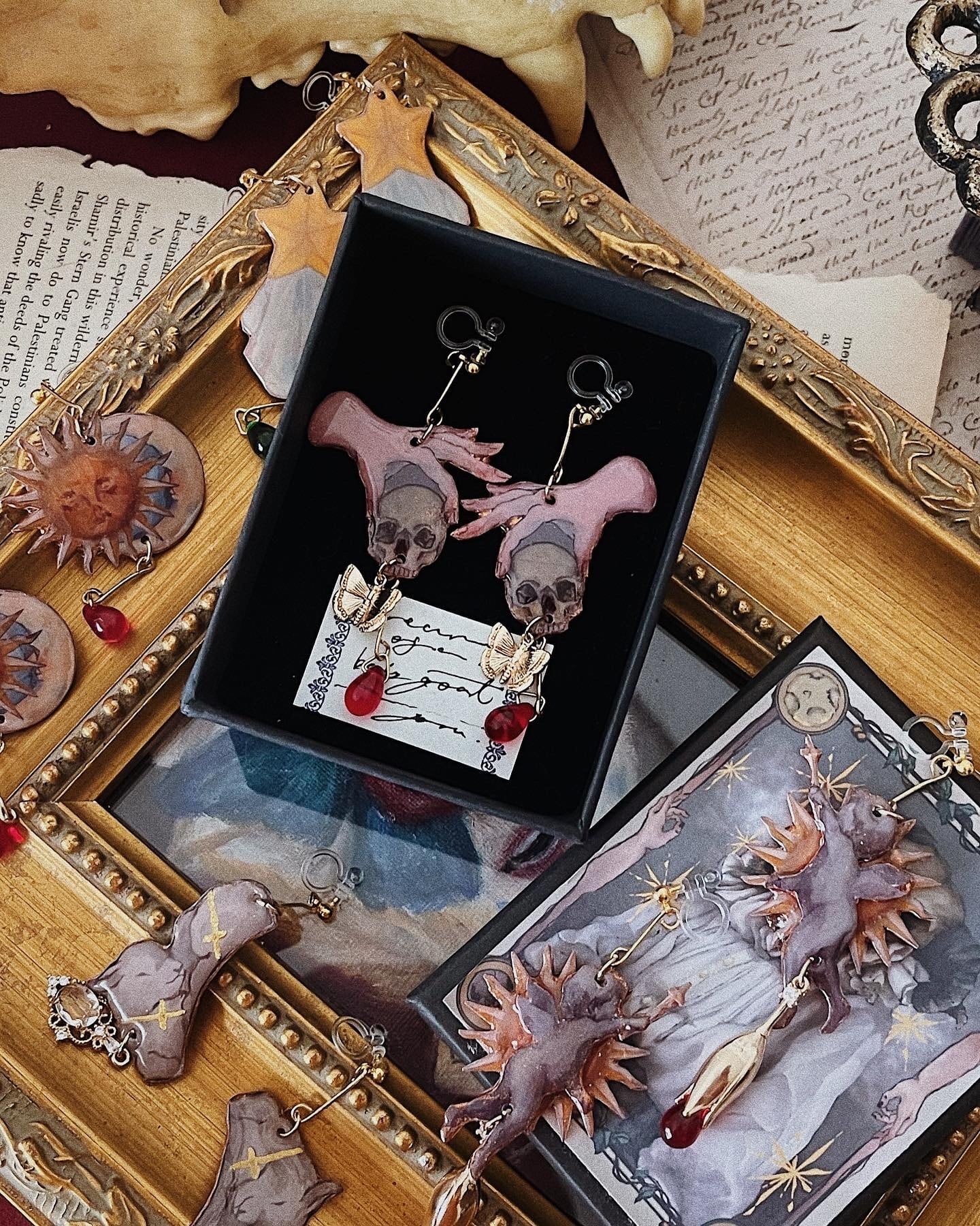 耳元で揺れるたび光がこぼれ落ちるように、たくさんの色を使って描かれたものたちの周りも後ろも、一つ一つ金色に染めています。