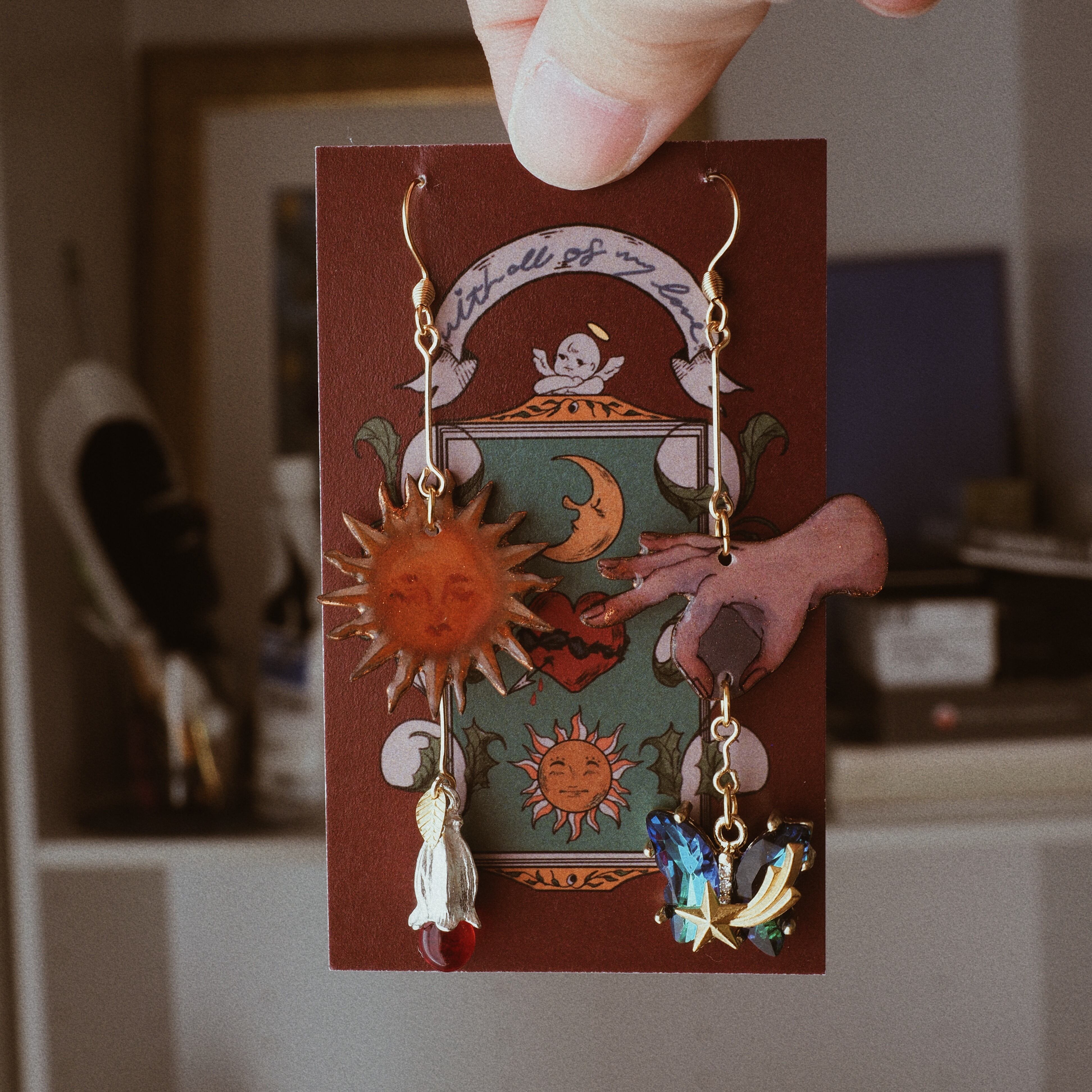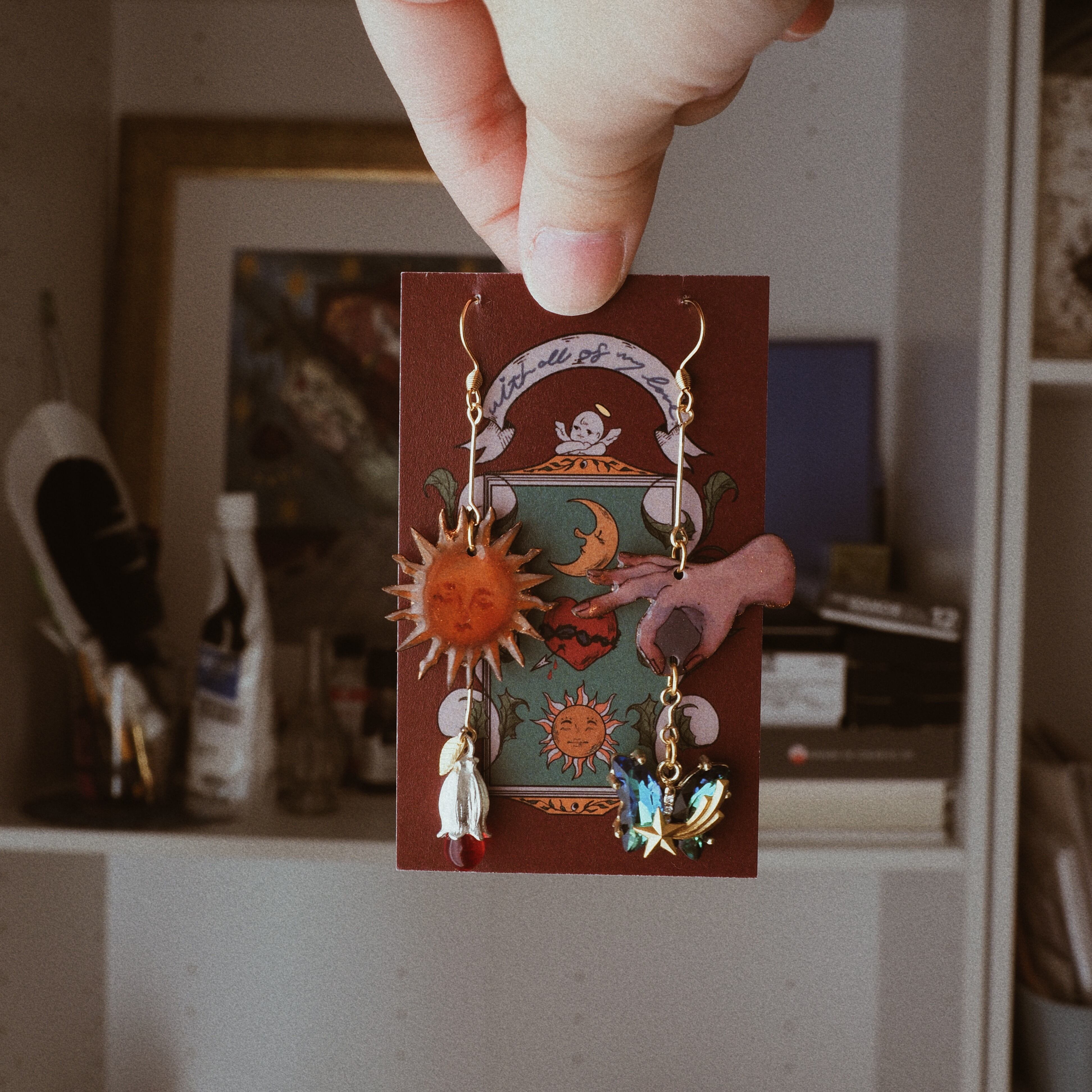 耳元で揺れるたび光がこぼれ落ちるように、たくさんの色を使って描かれたものたちの周りも後ろも、一つ一つ金色に染めています。