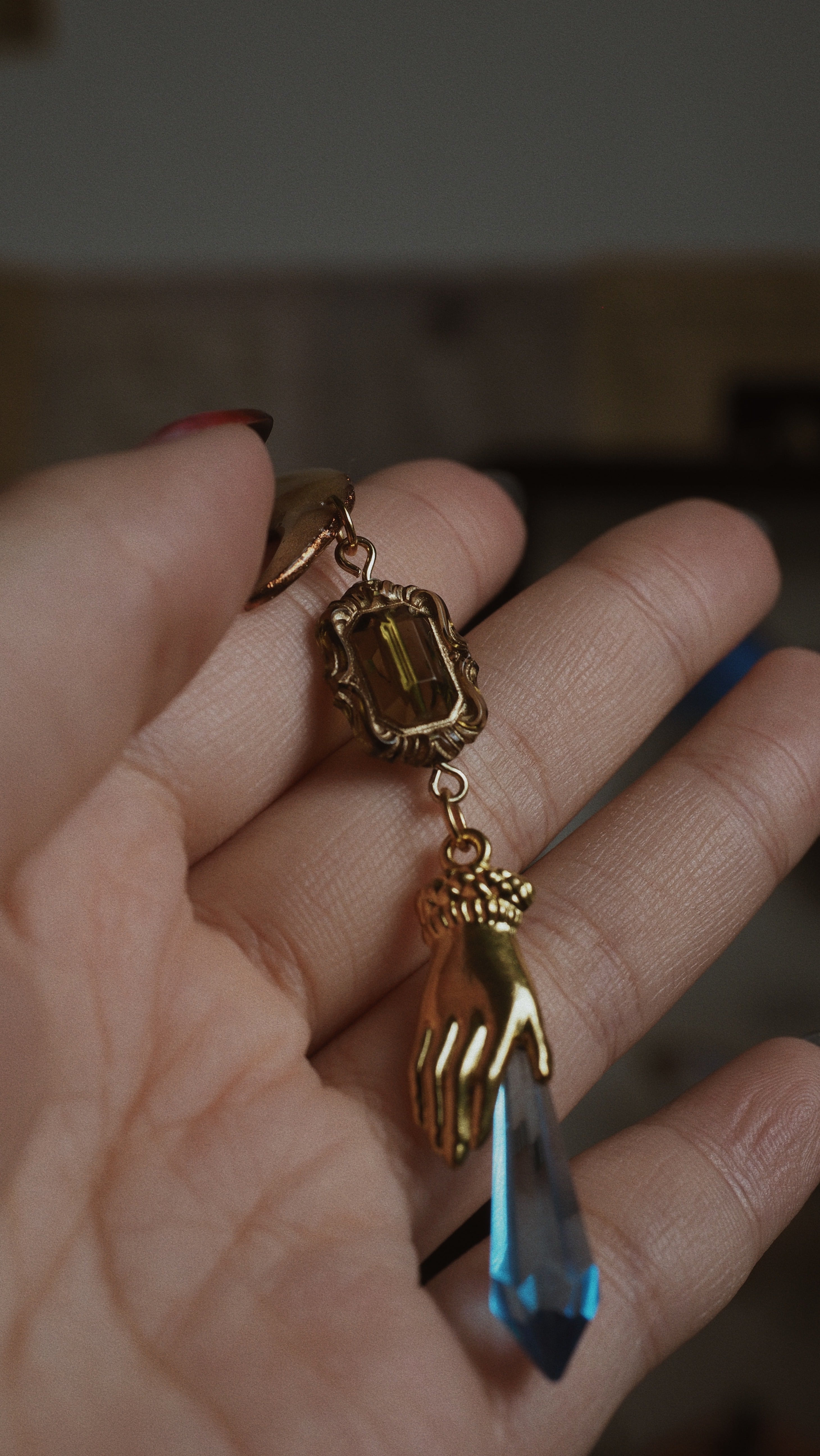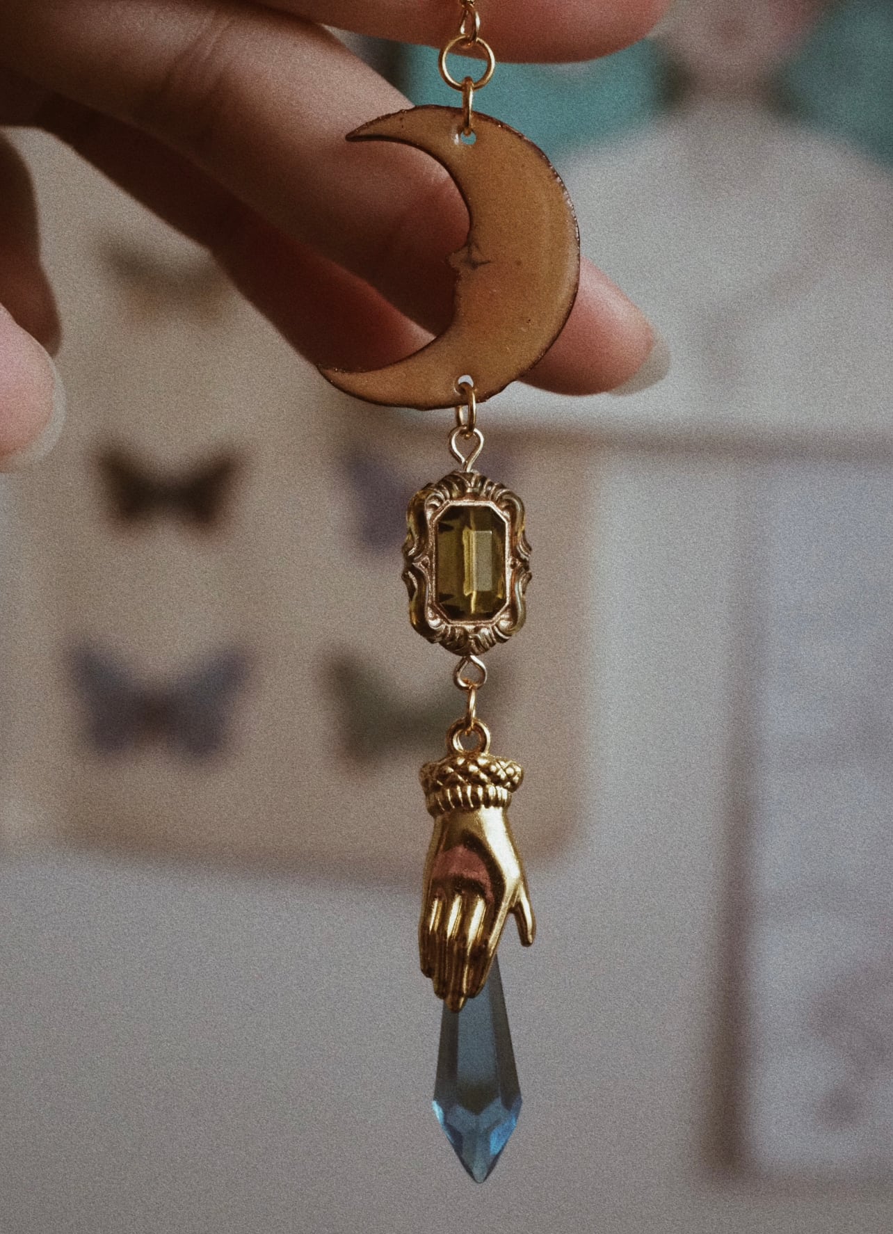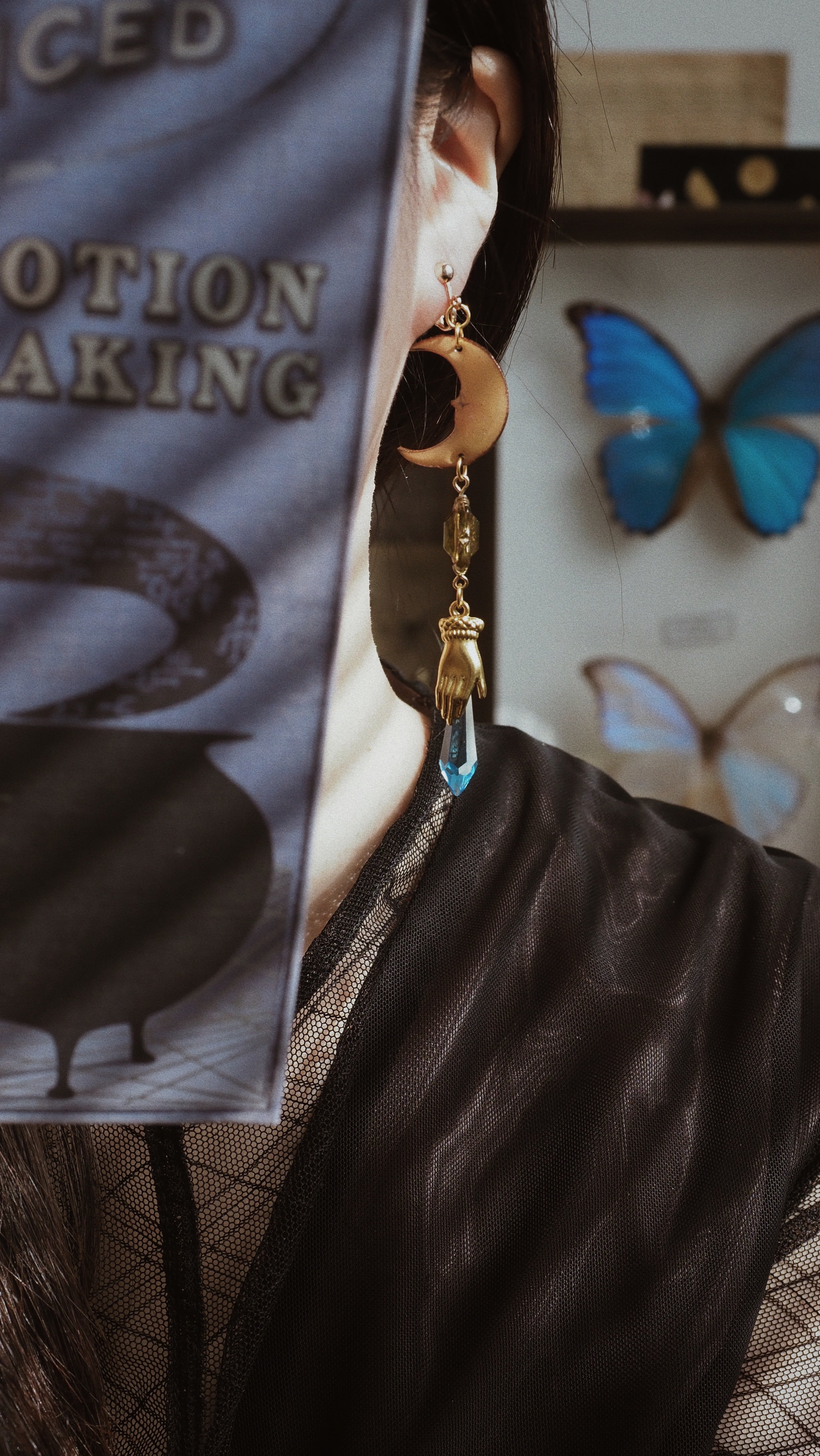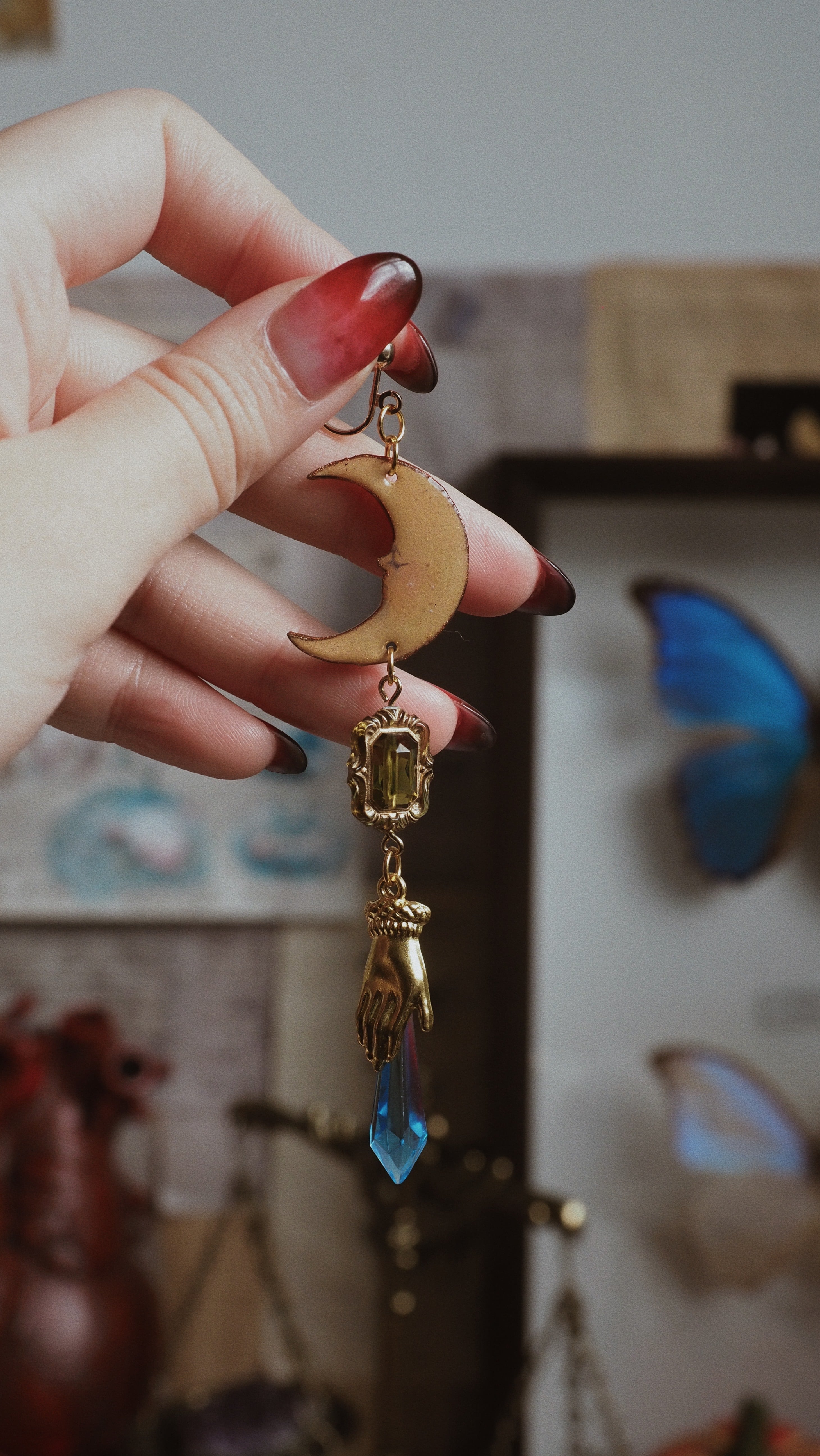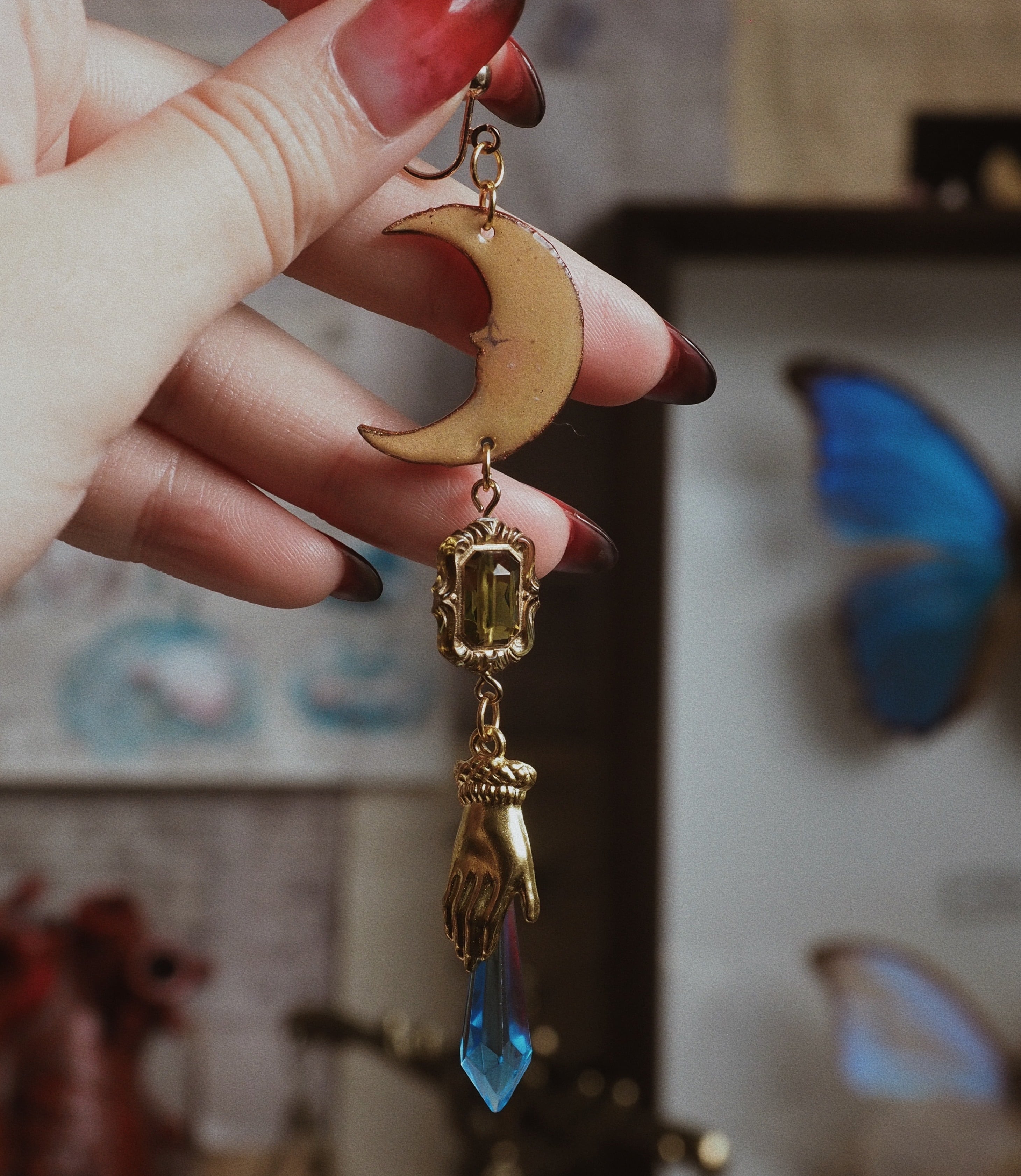 耳元で揺れるたび光がこぼれ落ちるように、三日月の周りも後ろも、一つ一つ金色に染めています。