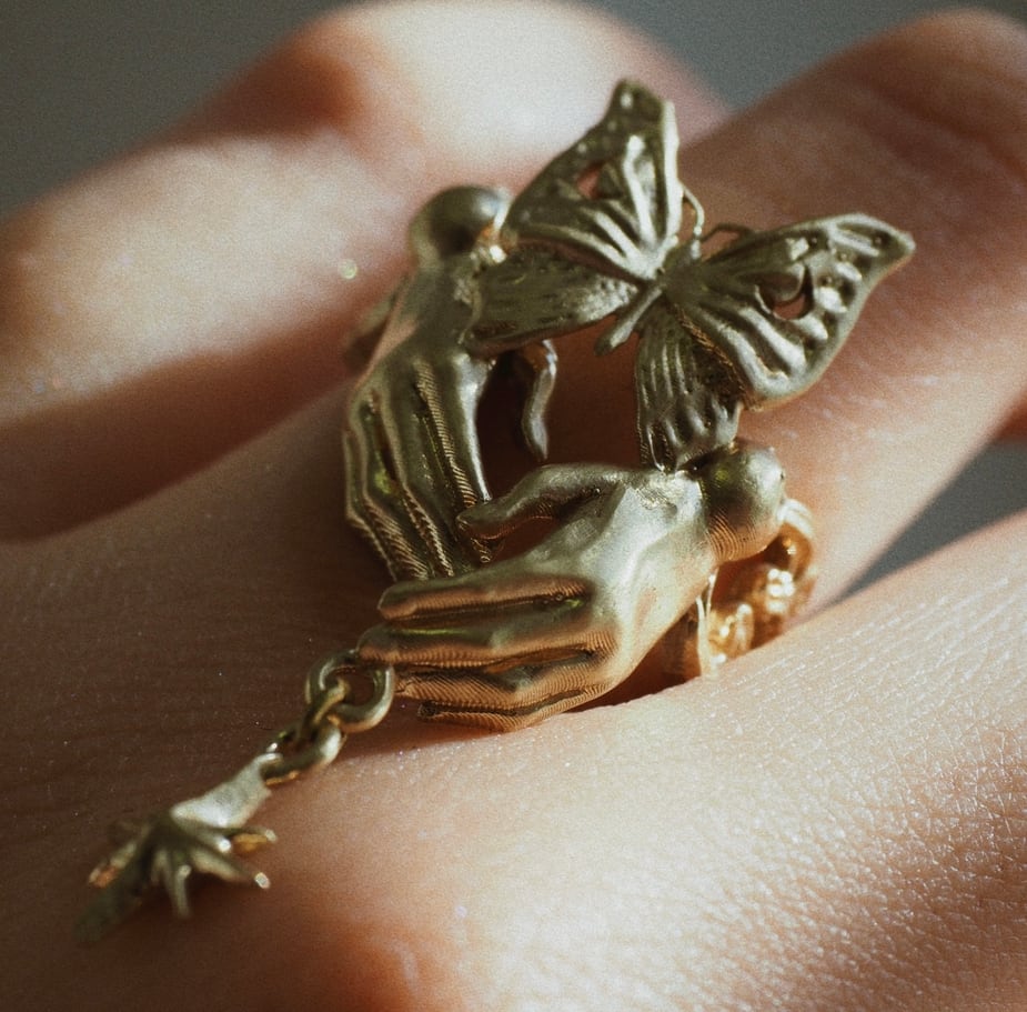 故人の魂が宿ると言われる蝶々と、いのちを持たない人形の手という、一見相反するものは、美しさとどこか退廃的な要素での繋がりを感じます。