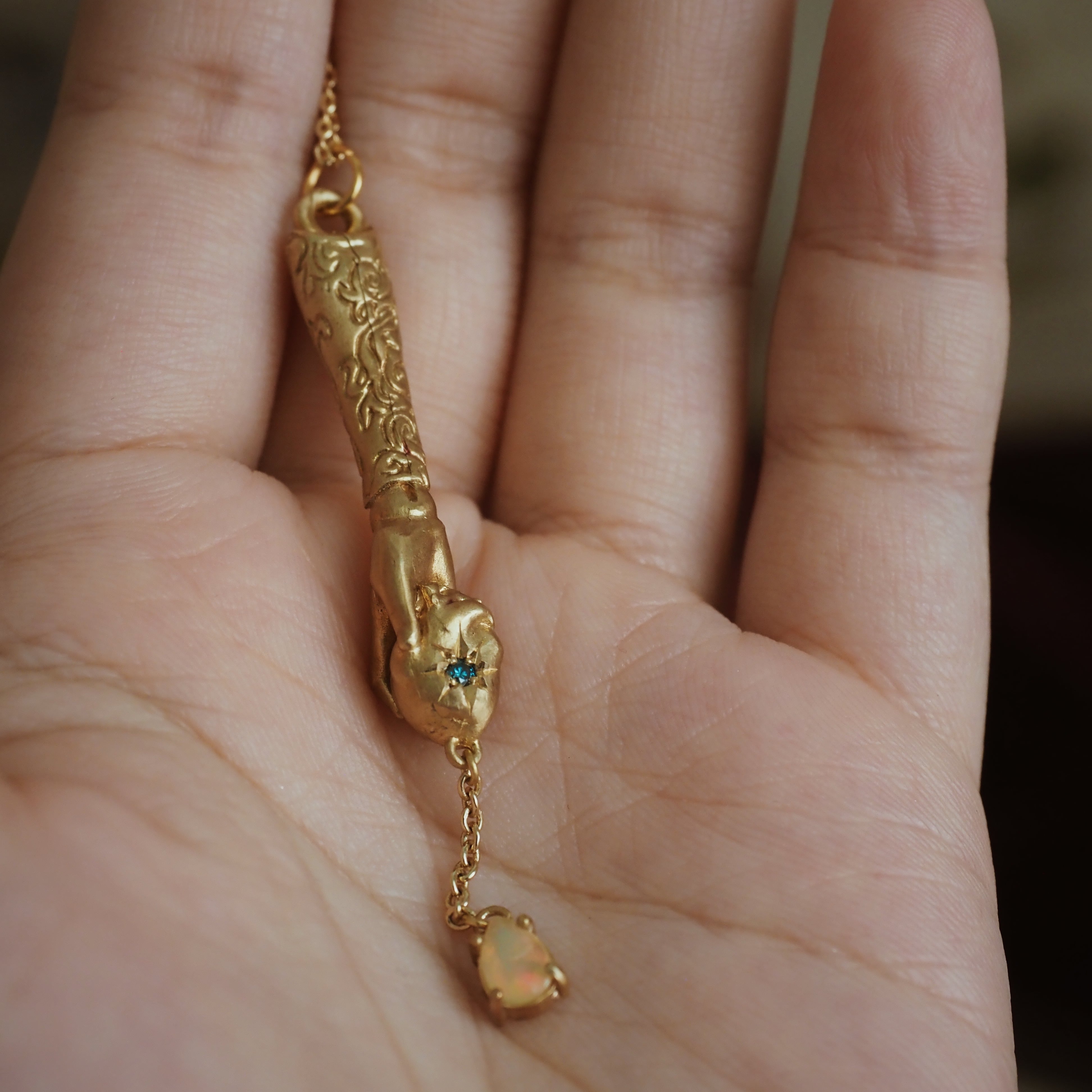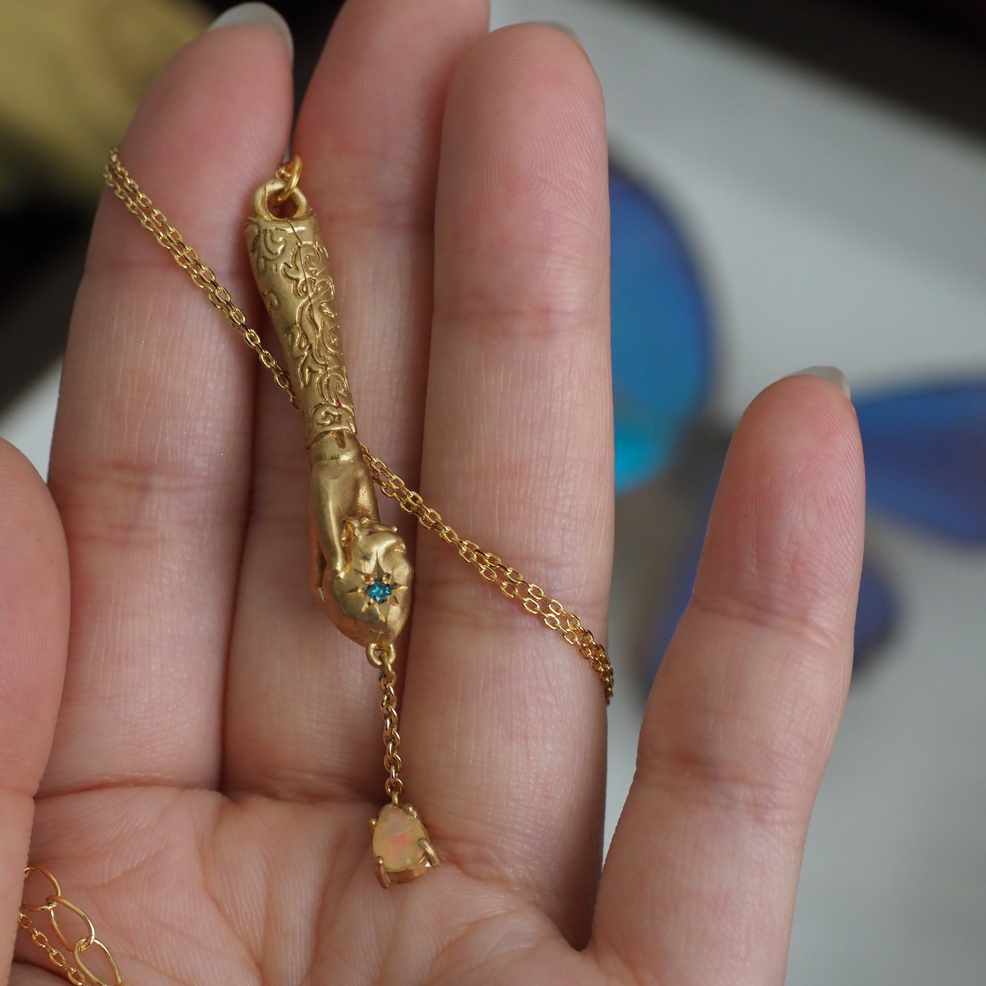 心臓には後光留めという、まるで星のような彫りの中心に埋められたブルーダイヤが、その下には人形の肌のようなオパールが美しく揺れ輝きます。